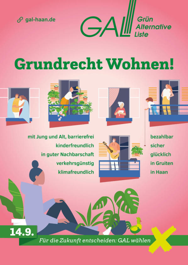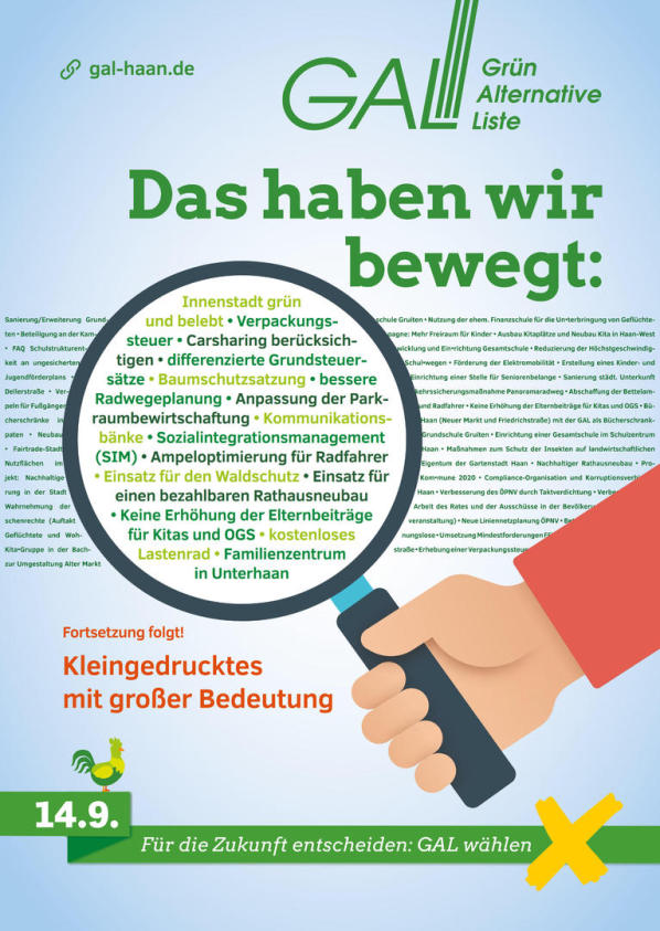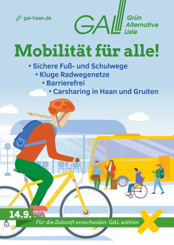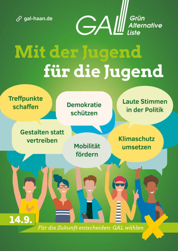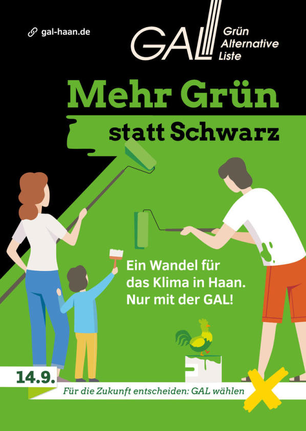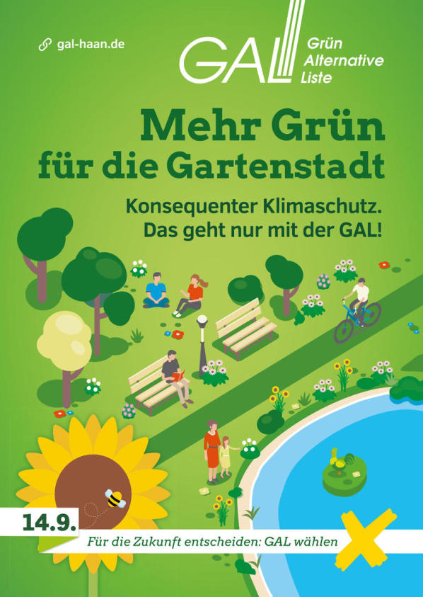 Grün-Alternative-Liste Haan (GAL Haan) unter dem Motto „Haan braucht Bewegung“ Umwelt- und Klimafreundlich, hass frei, nazifrei und demokratisch mit einem nachhaltigen Interesse an der Stadt Haan.